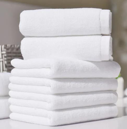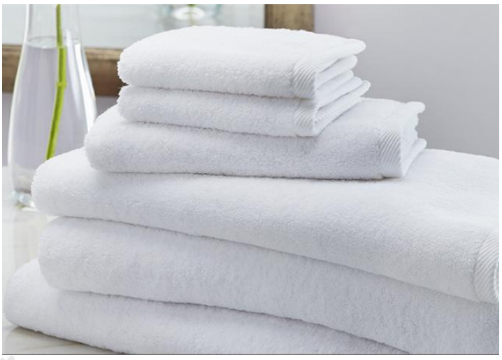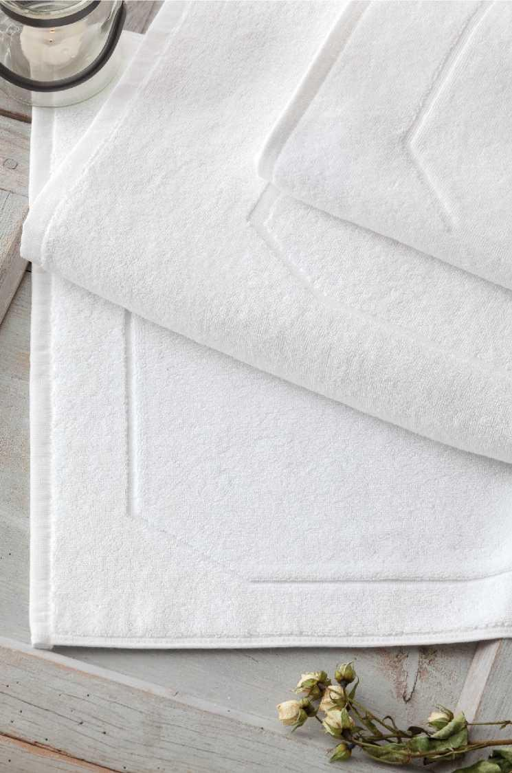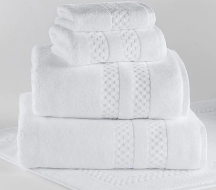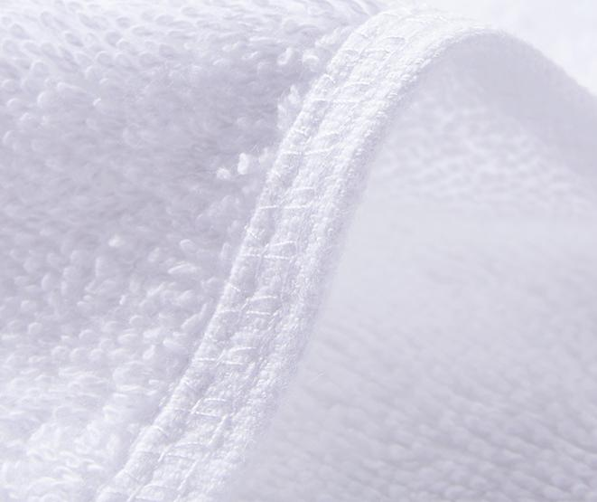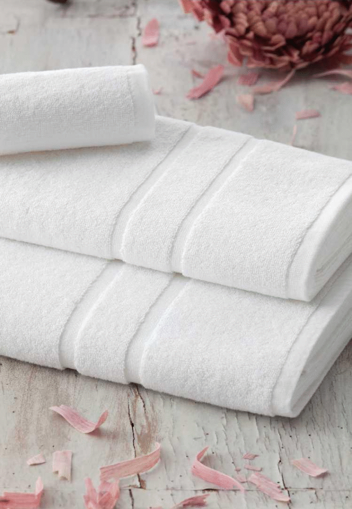 100% cotton extra, single loop terry. White colour.Maximum softness, minimal shrinkage. Special confection with distinctive dobby borders